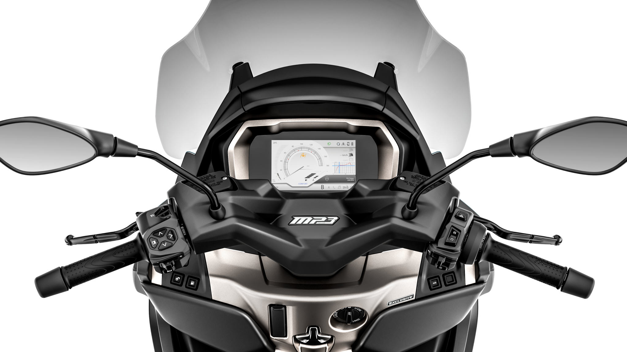 Piaggio, de uitvinder van de driewielige scooter, vond de stedelijke mobiliteit opnieuw uit met de MP3 en begint nu aan een nieuwe revolutie met de nieuwe MP3 400 hpe, MP3 400 hpe Sport en MP3 Exclusive 530 hpe. Modellen die prestaties, technologie en veiligheid op het hoogste niveau brengen dankzij vele van de auto afgeleide functies zoals BLIS, achteruitrijcamera en cruise control. De nieuwe MP3’s, die ook met rijbewijs B* mogen worden bereden, hebben het grootste TFT-kleurendisplay in zijn categorie, nog efficiëntere Euro 5-motoren en alles wat u nodig hebt om van elk stadsgezicht te genieten.